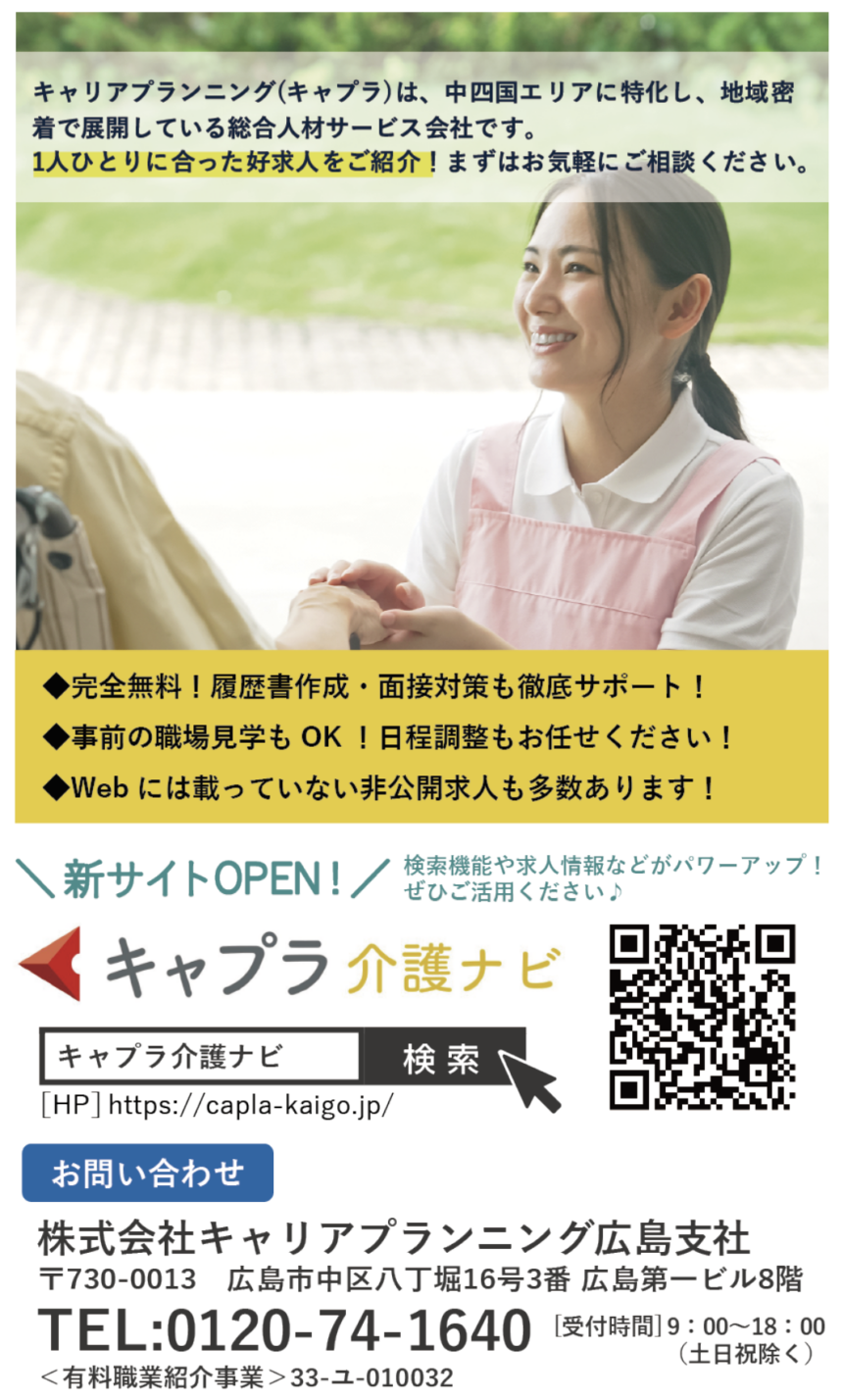 | お問合せ:広島市佐伯区八幡2-23-15 会社名:株式会社キャリアプランニング広島支社 Tel 0120-74-1646 |